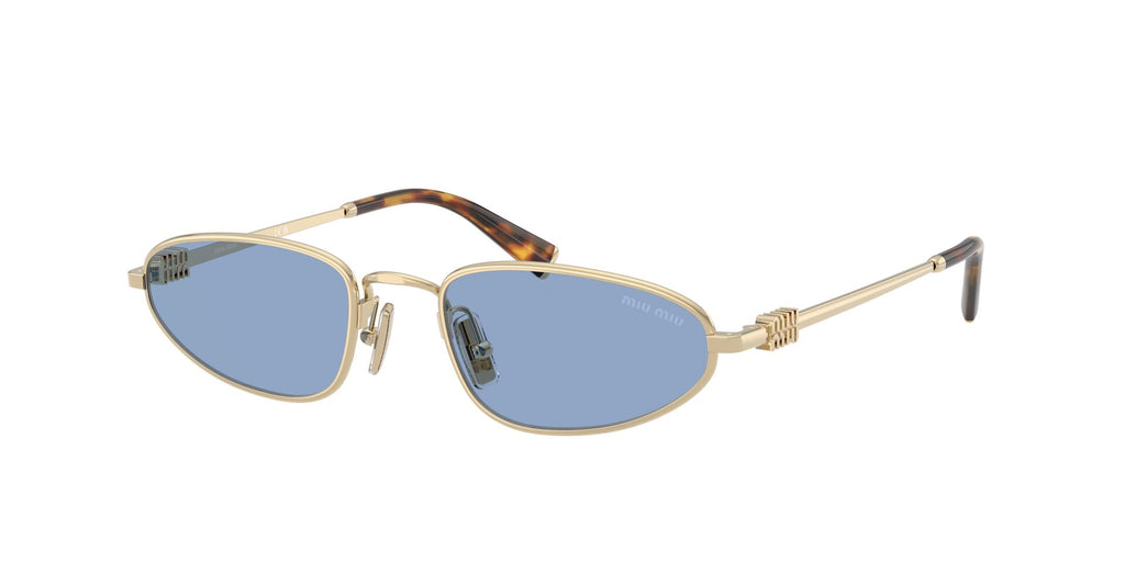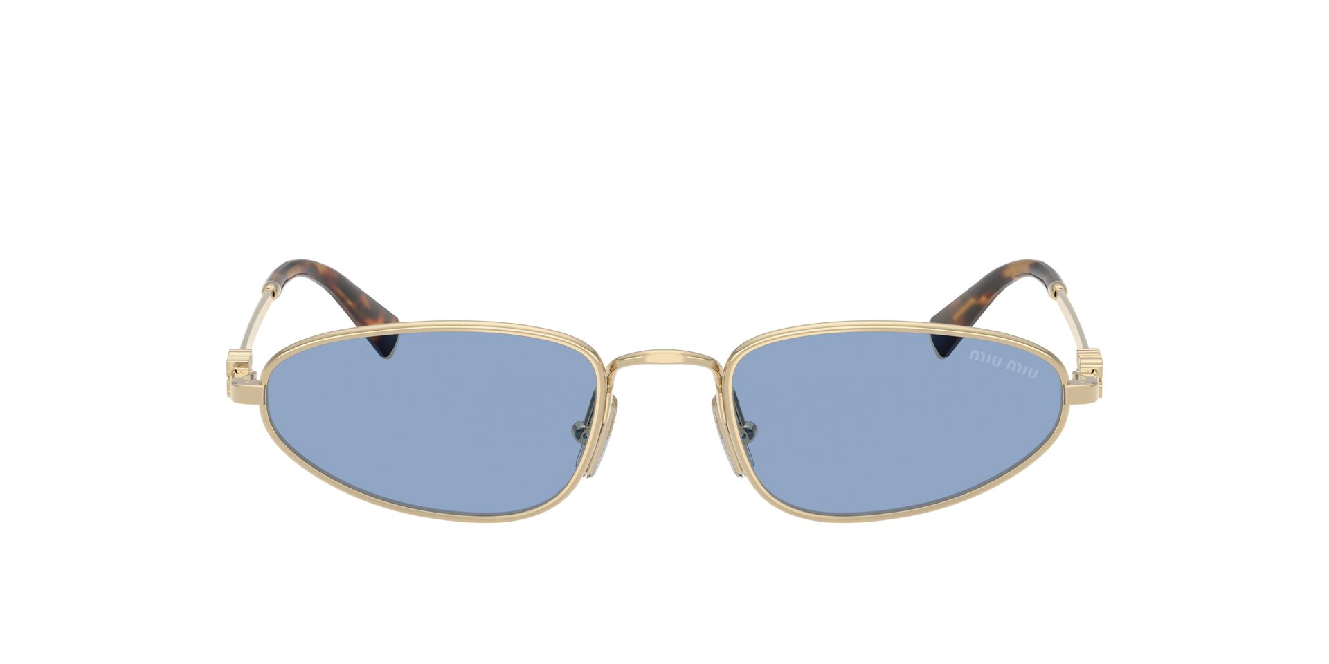 Tα Γυαλιά ηλίου MIU MIU A52 ZVN-60O 5219 είναι γυναικεία, μεταλλικά, με χρυσό σκελετό μακρόστενου σχήματος με στρογγυλεμένες γωνίες. Οι βραχίονες είναι μεταλλικοί χρυσοί με κοκκάλινα ακροβραχιόνια. Οι φακοί τους είναι μπλε χρώματος και φέρουν 100% προστασία από την υπεριώδη UV ακτινοβολία.