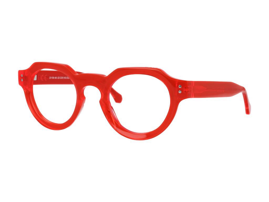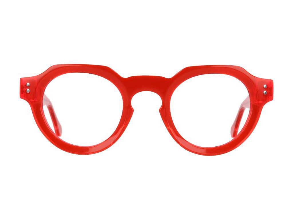 O-SIX OV-164 019 4825 unisex eyeglasses are handmade and consist of red - transparent, acetate frame in round shape.
