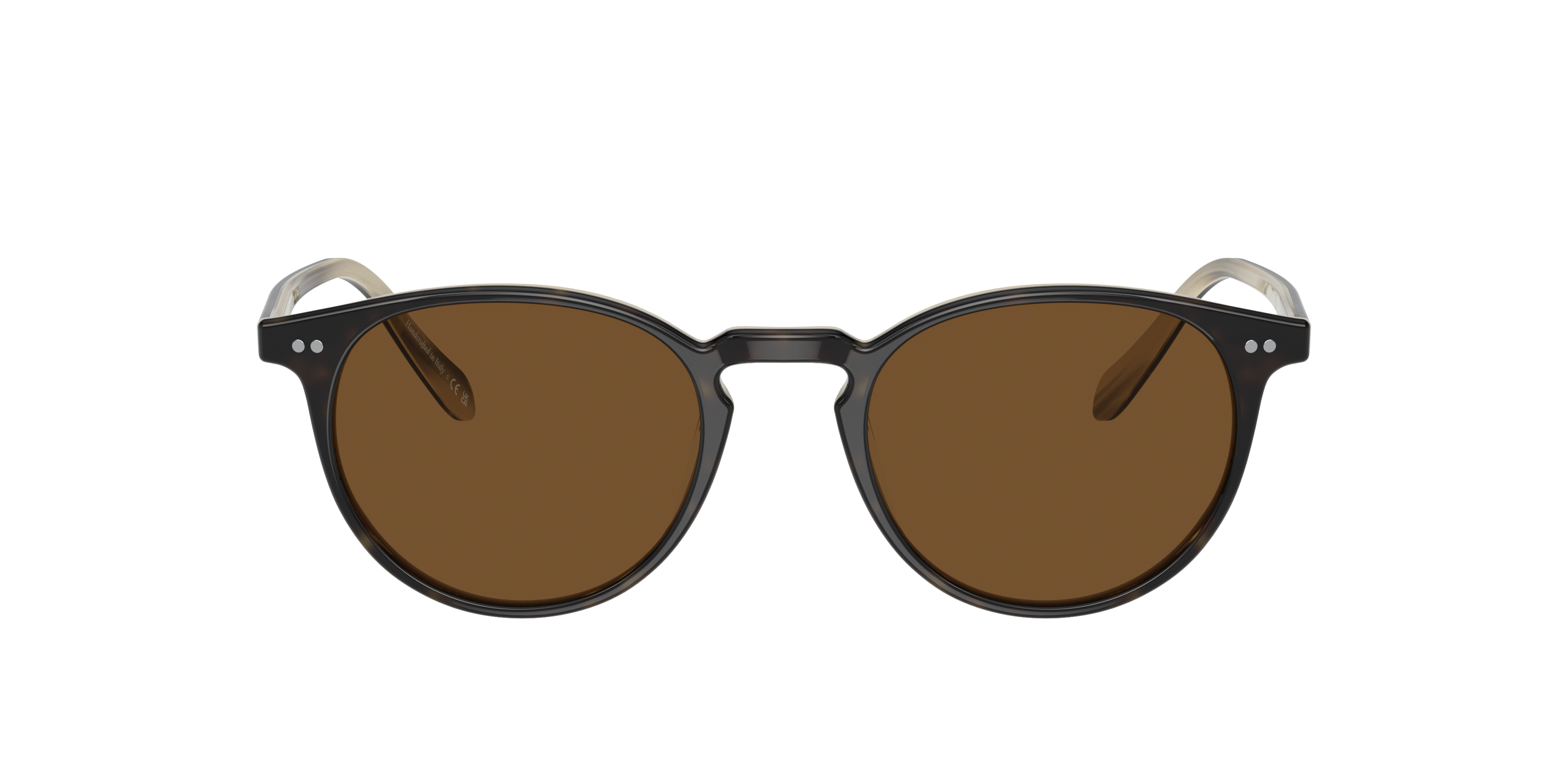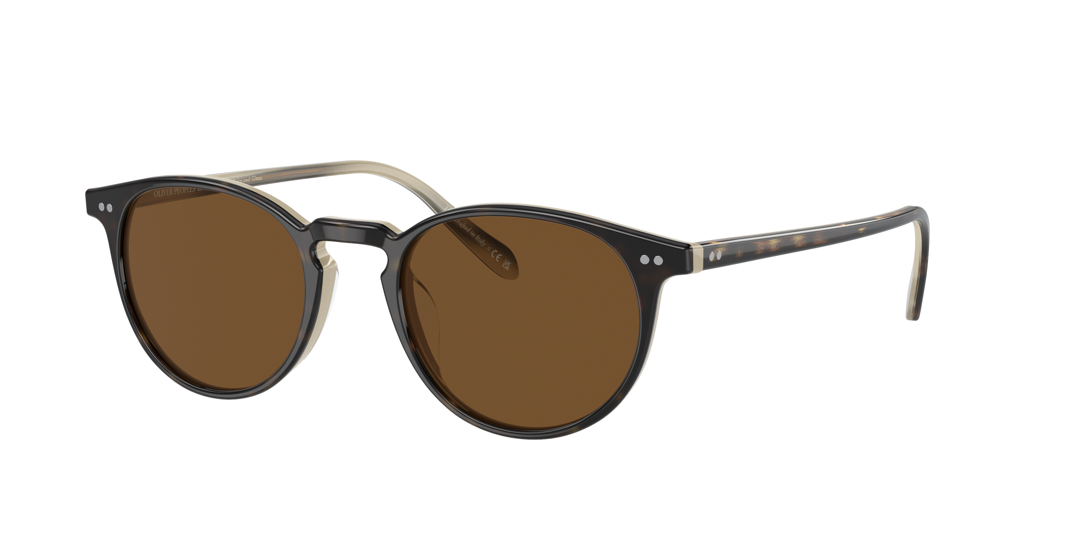 OLIVER PEOPLES RILEY SUN 5004SU 166657 4920 unisex handmade sunglasses consist of brown tortoise round acetate frame. Inside the frame becomes lighter beige honey tortoise color. Their lenses are brown polarized cat 3P which provides 100% protection from UV radiation.